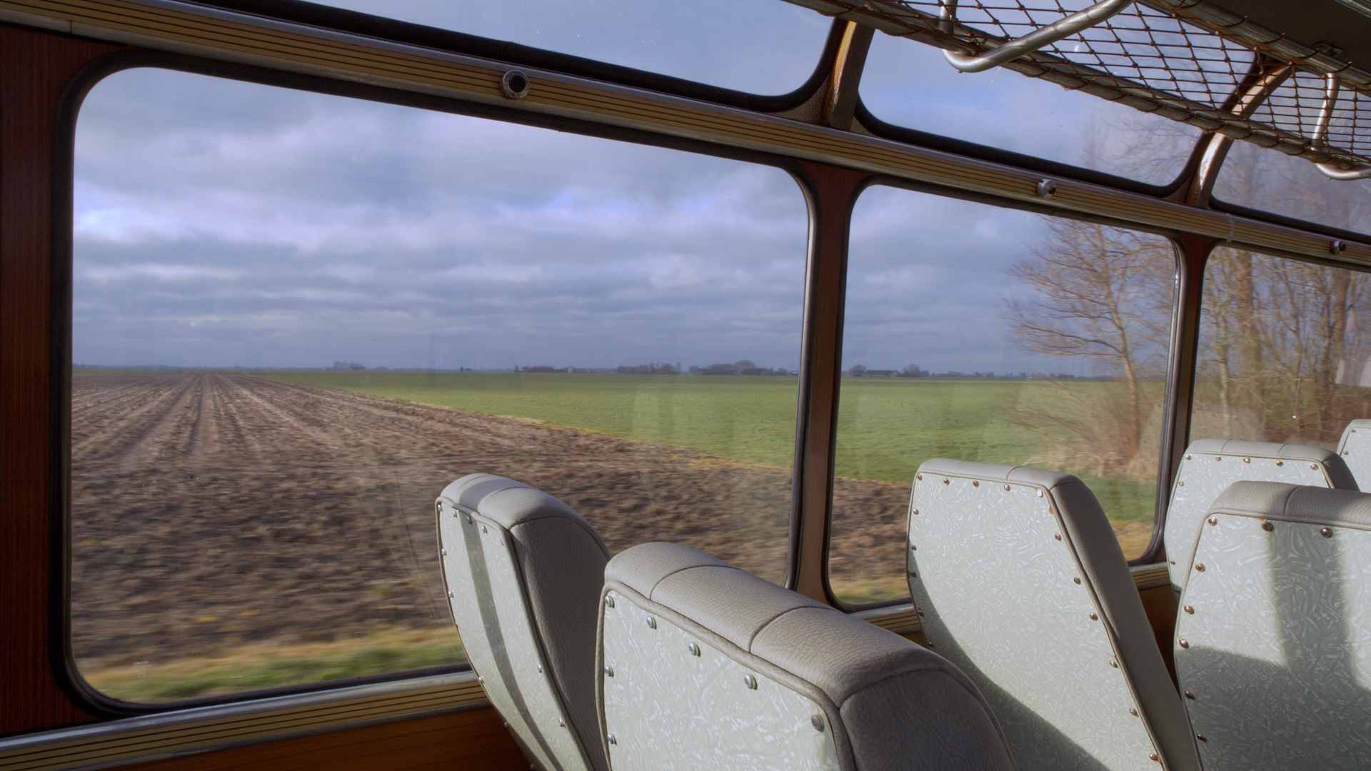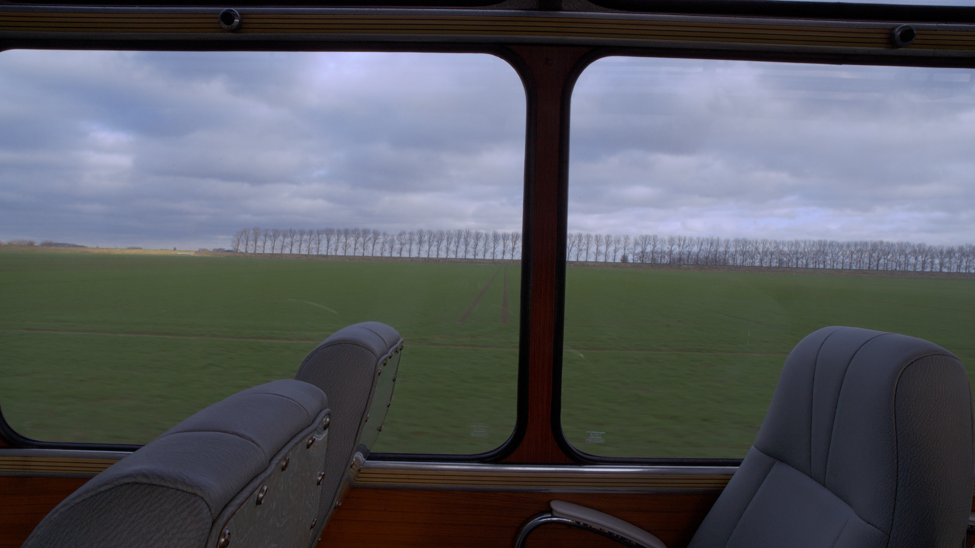 ENG: A bus from 1965 drives through the countryside of Noord-Groningen. The camera is situated in the middle of the bus and keeps one wind direction while the bus moves. When the bus drives and takes turns, the view changes each time. Both the landscape and the bus are perceived as individual characters in the video.