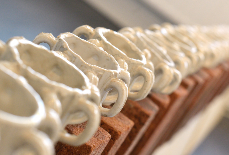Zeventig roterende kopjes zijn te zien die ieder op een verticale baksteen staan. Aangedreven door elektromotoren functioneren de oortjes van deze kopjes als tanden van een tandwiel. Het contact van de keramische oortjes tegen elkaar zorgt voor het bekende hoge tingelende geluid, het schuren van de kopjes zorgt voor een mooi laag ‘vijzelachtig’ geluid.